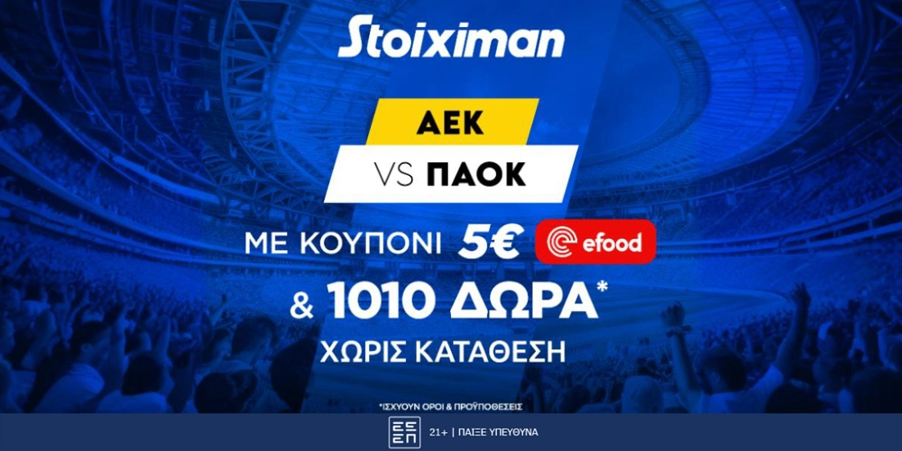 Ντέρμπι ΑΕΚ-ΠΑΟΚ με 1010 Δώρα* & Κουπόνι 5€ efood χωρίς κατάθεση* από τη Stoiximan!